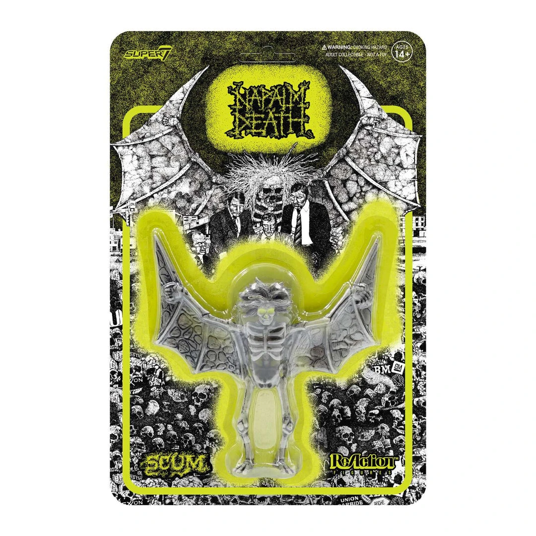 Inspired by the 1987 debut album on Earache Records from England’s grindcore pioneers Napalm Death! The 3.75” Scum Demon ReAction figure is encased in a blister on a cardback that mirrors the influential album’s cover. Also, this lime green colorway matches the album’s first pressing!